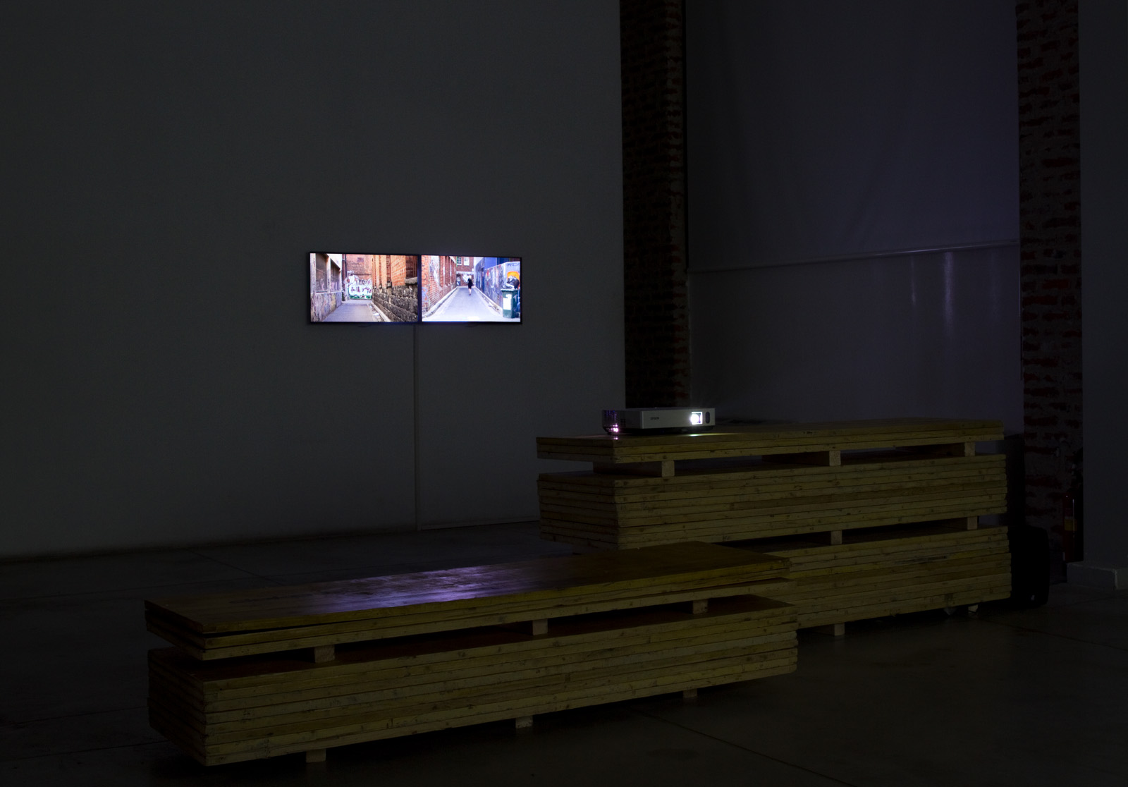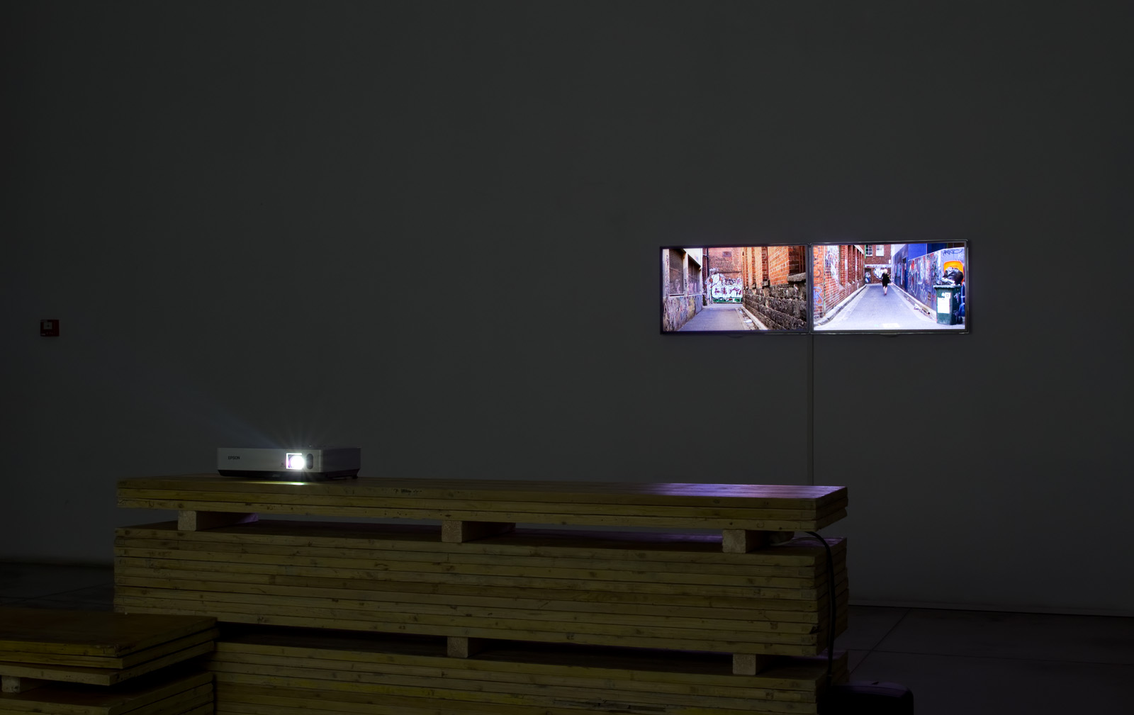 The two works by Simone Hine, presented in Moving Picture/Expanding Space, were shot within the two galleries of this exchange, Screen Space (Melbourne) and Careof (Milano). Both works present scenes that are still: 11:35am presents an empty laneway and The Wait presents what appears to be a performer standing in the gallery. This stillness is interrupted by a cinematic gesture that activates each space to transform the otherwise plainly filmed scene into a site of cinematic narrative.