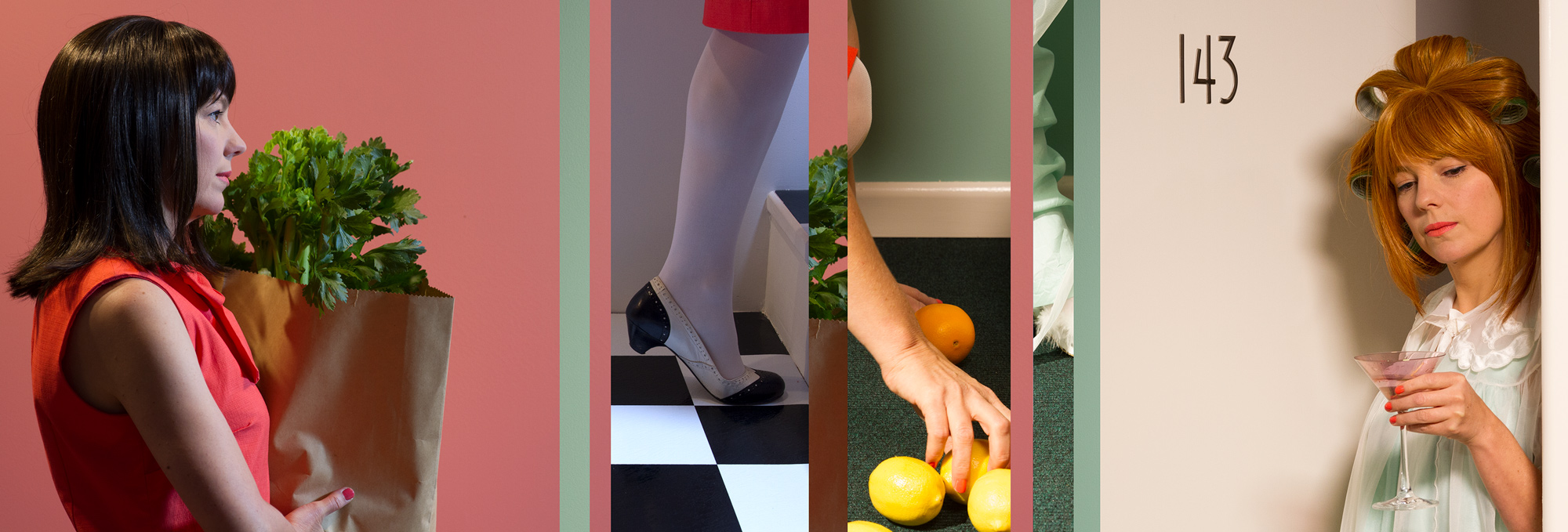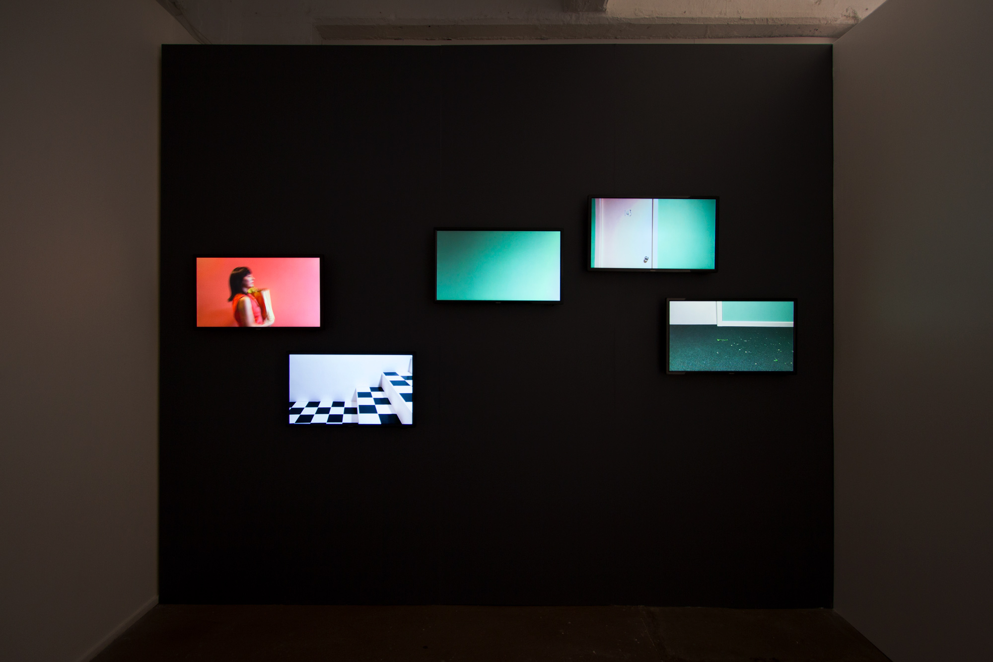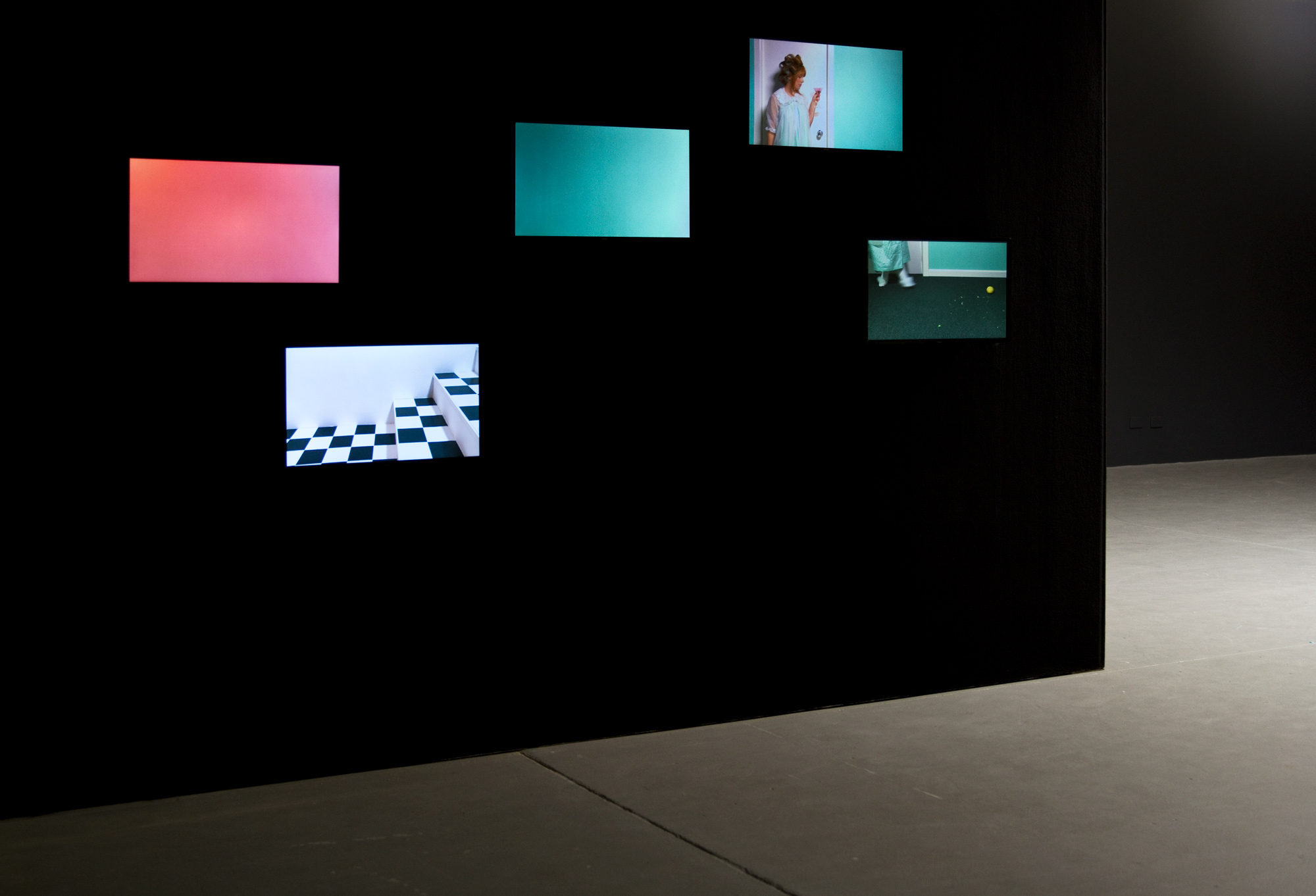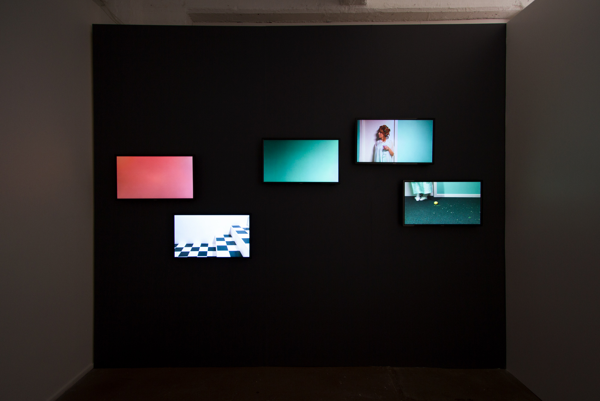 The five-channel video has the appearance of a small incidental scene from a 1960s sitcom that is looped continually. Contrary to appearances, the five-channel video documents a continuous performance: a series of events that are repeated again and again, over the 107 minute duration. The length of the performance was determined by the recording capacity of the cameras. The videos include a fade in and out between the appearances of each character. These fades have the appearance of post-production edits, but were created through the use of physical lights, with dimming control, captured in-camera. In other words, the work appears to be a brief looped section (approximately three minutes in duration), but is actually the documentation of a single performance where the same two scenes are continuously repeated until the camera disks are full.