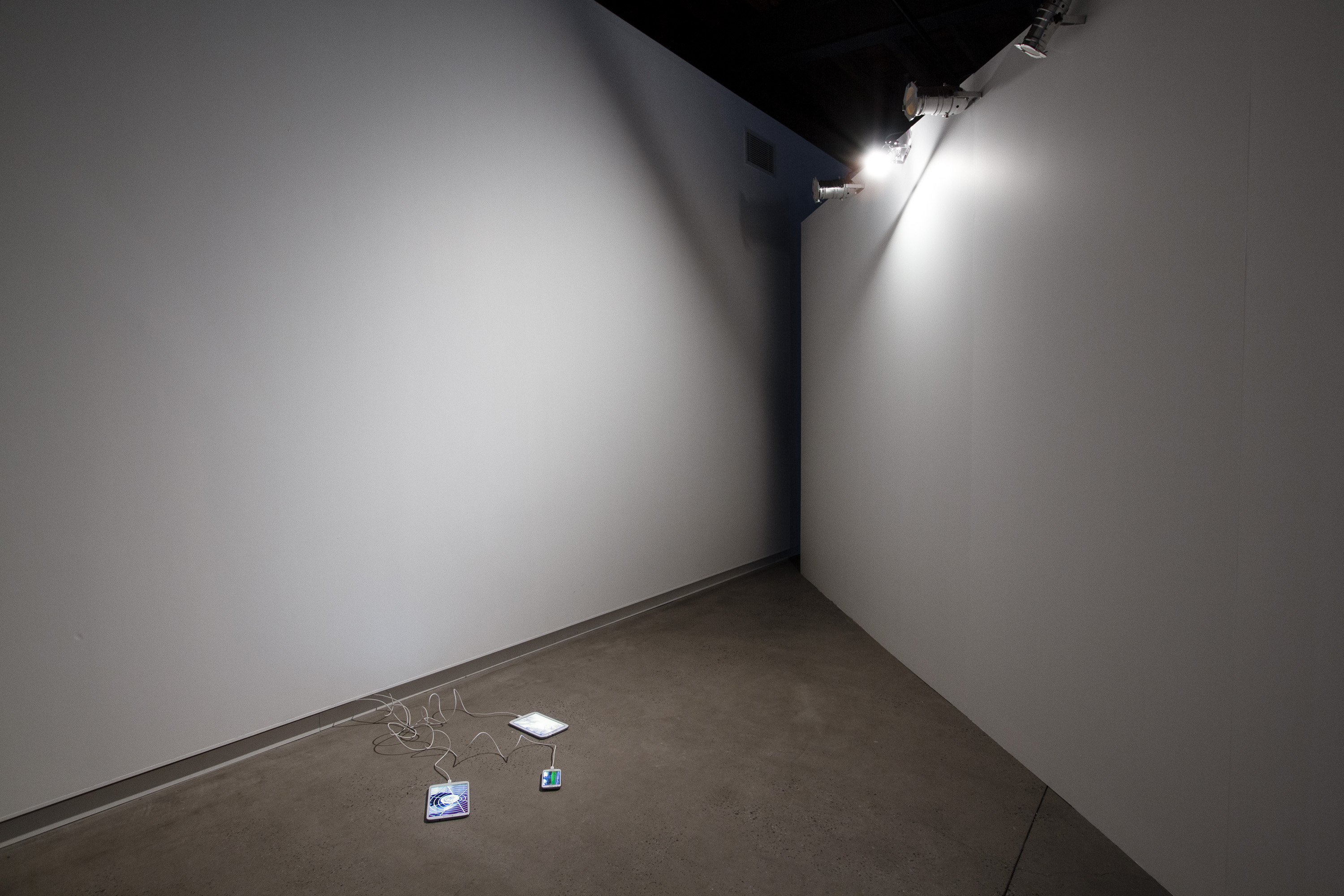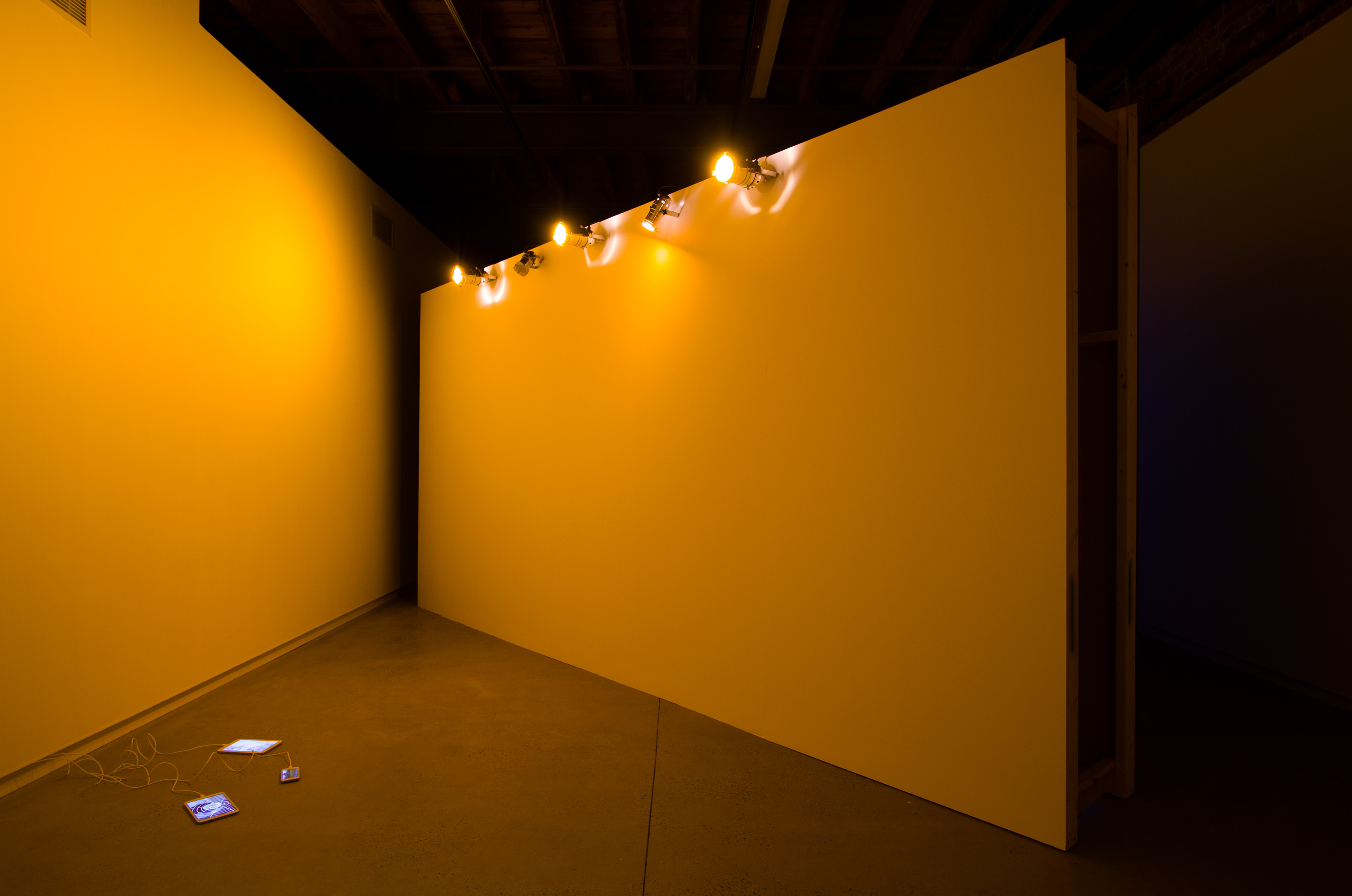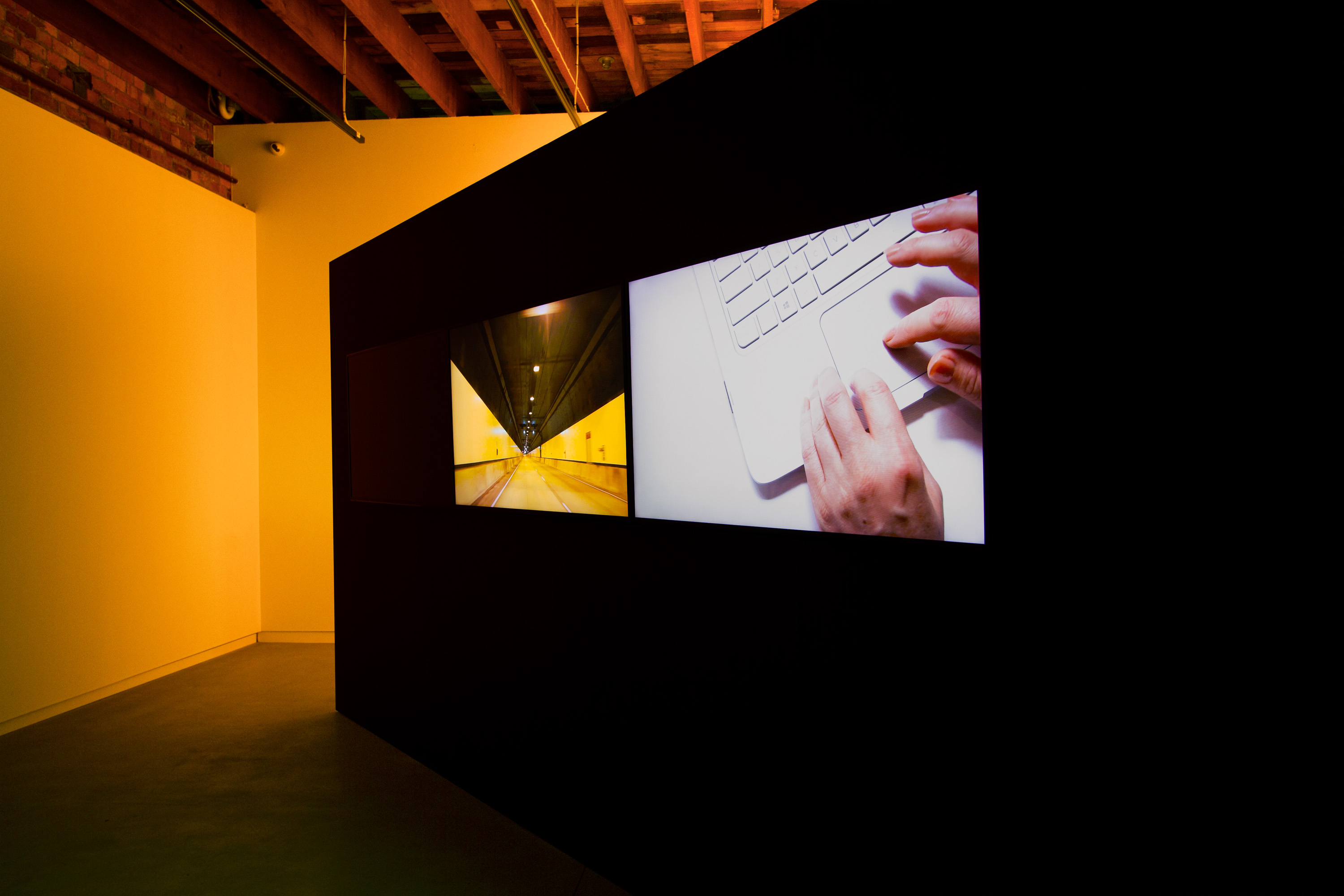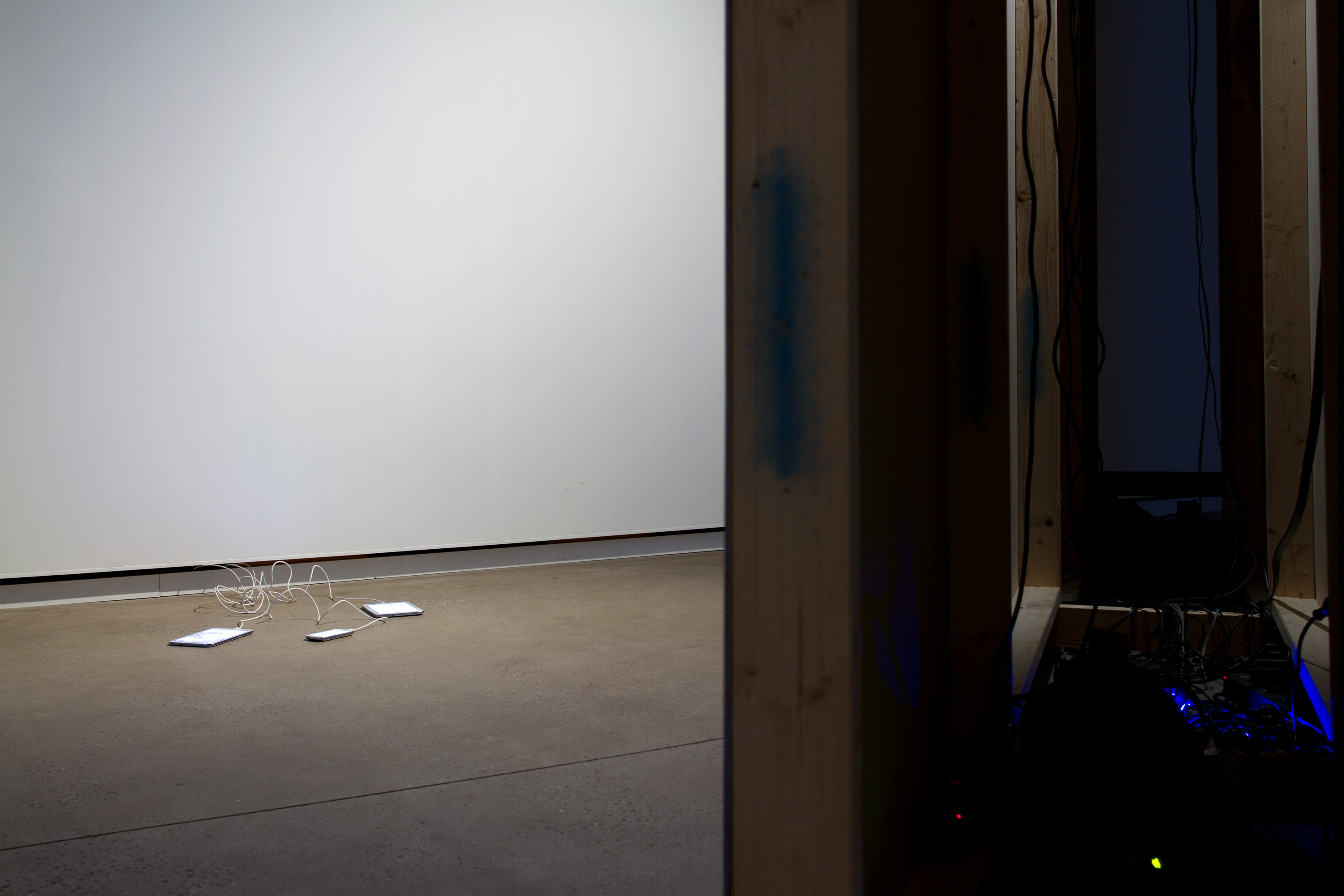 As you enter the gallery three devices lay on the floor, each plays a single shot looping. A static moving image of a park, a close-up of an industrial fan and the perpetually spinning image of a grey sky through denuded trees of winter. Intermittently, the light in the room changes from a cold steel-white wash to a yellow that drowns the room in intense colour. The room is divided by a temporary wall that cuts the space at a diagonal. Sound from a three-channel video on the other side of the temporary wall can be heard, drawing the viewer further into the space.