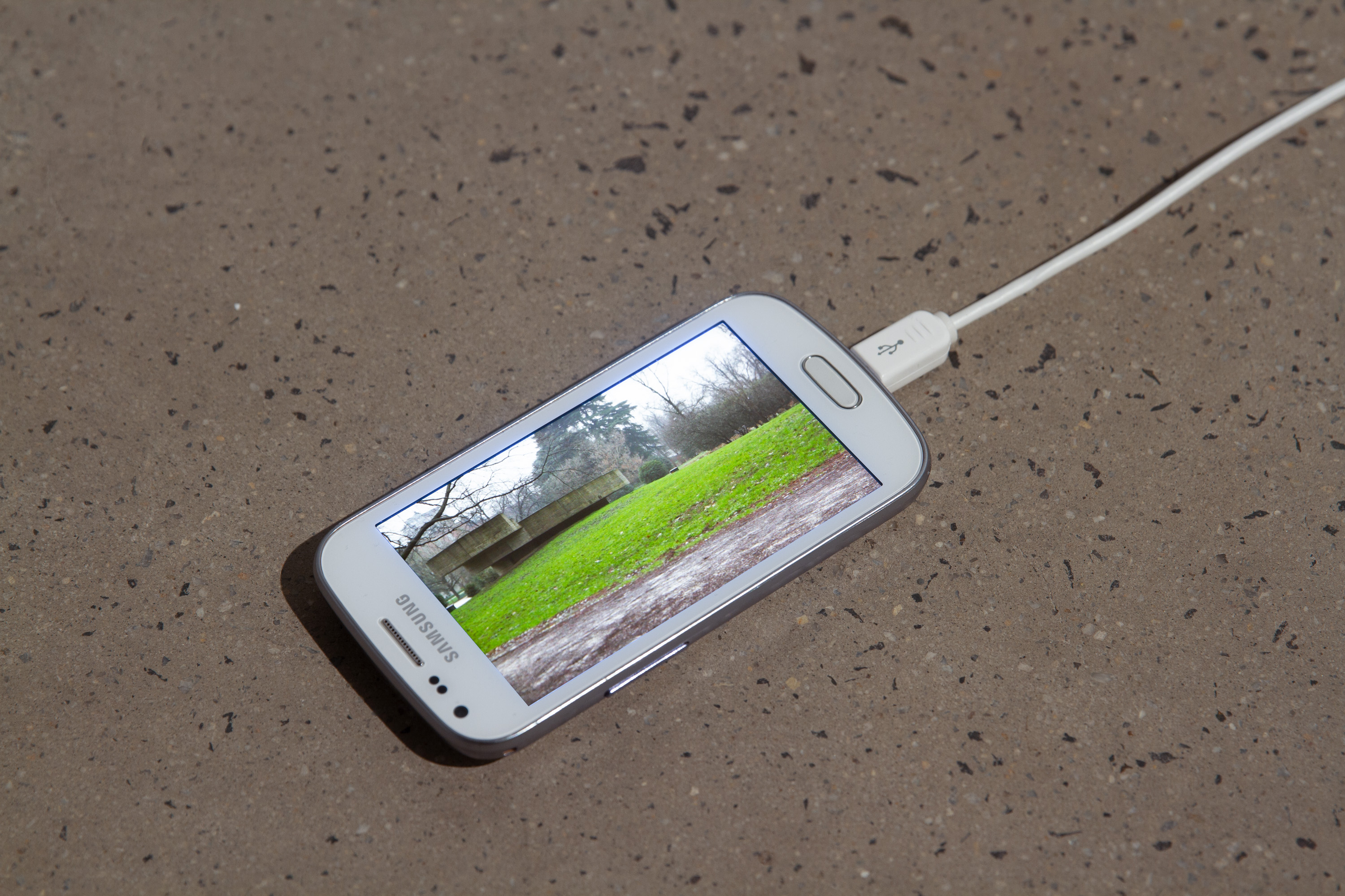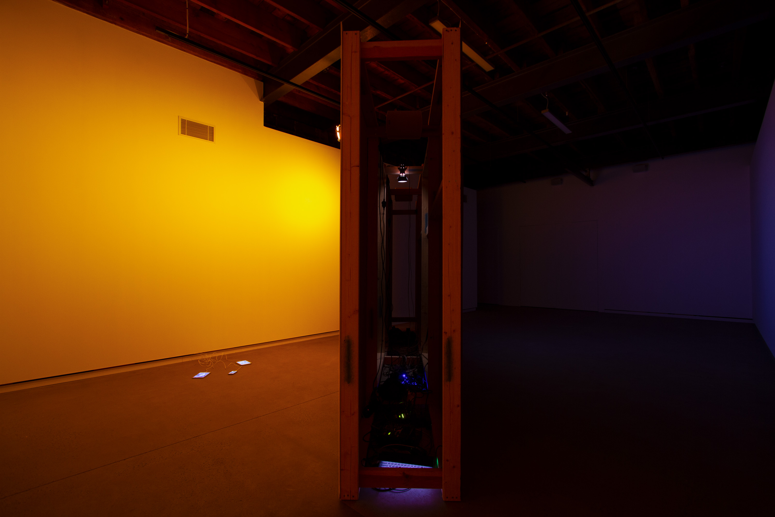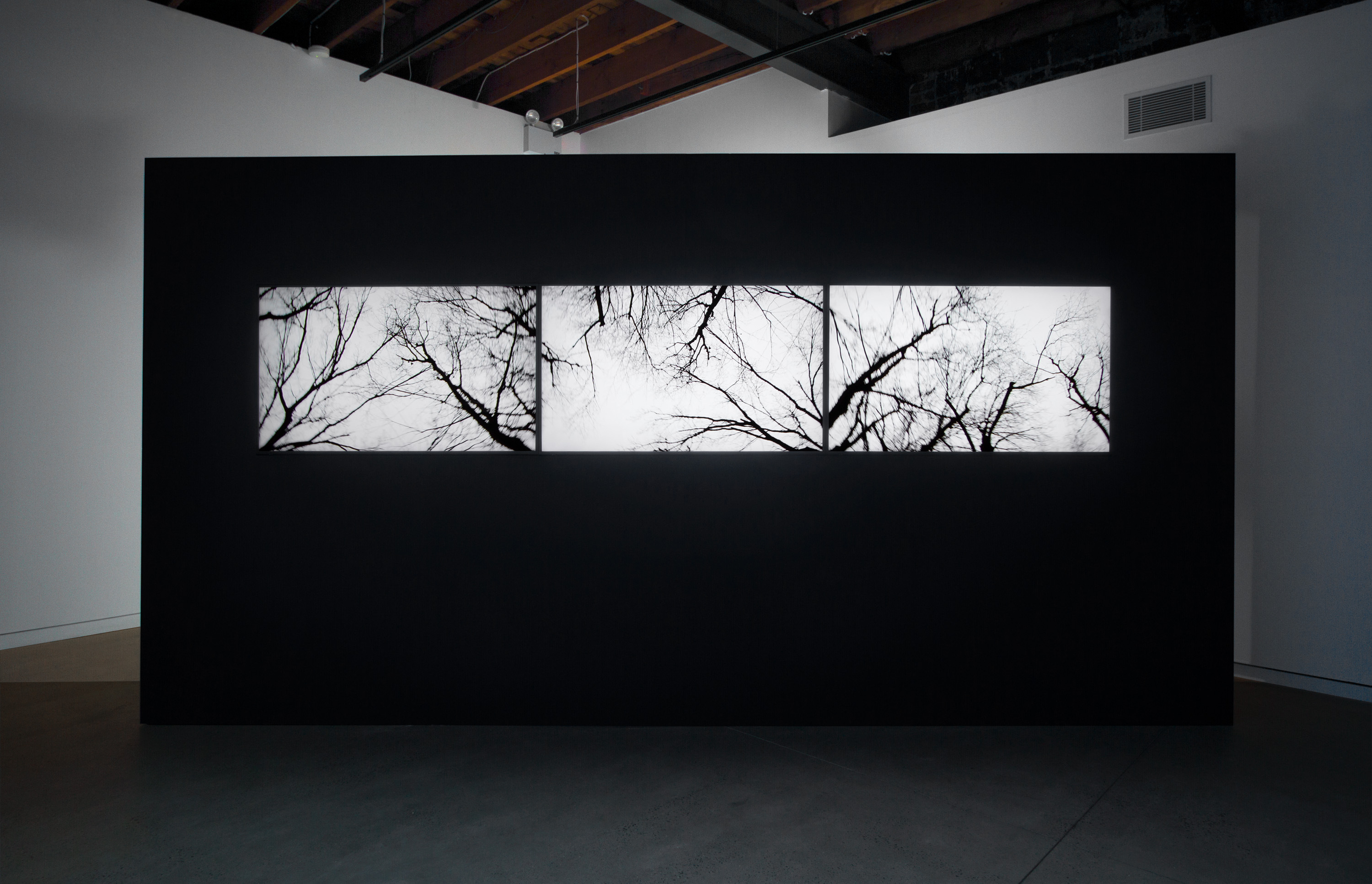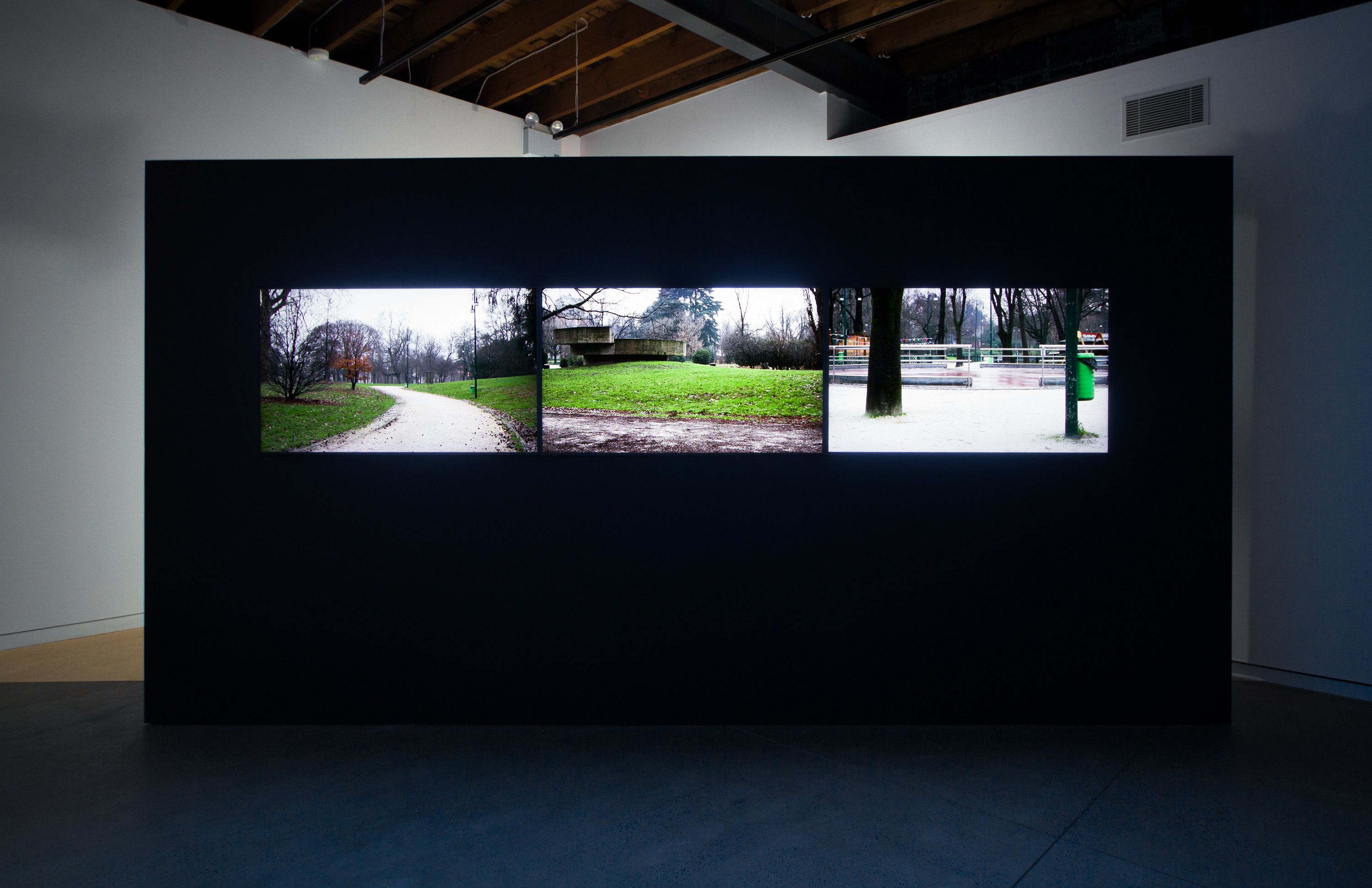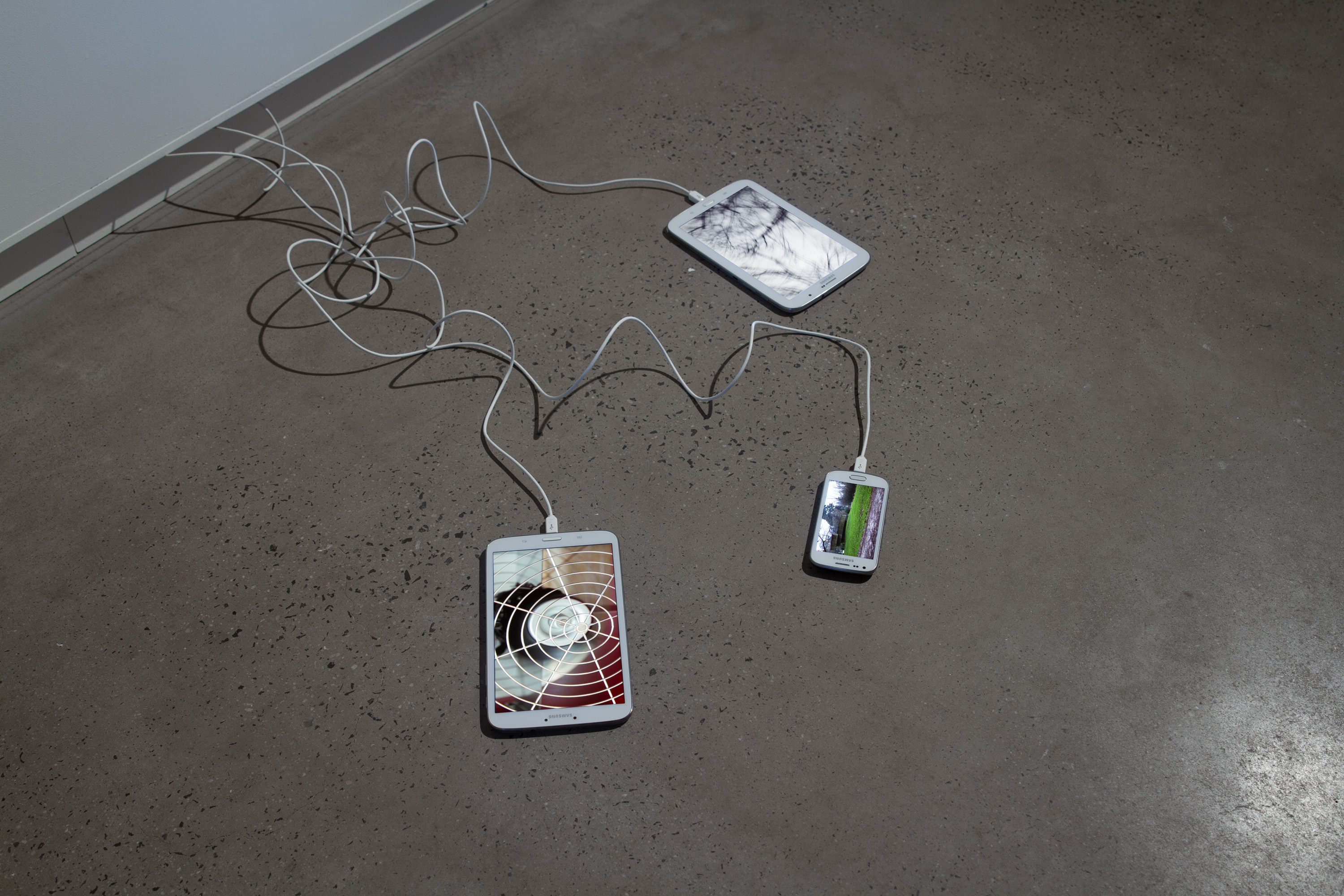 As you enter the gallery three devices lay on the floor, each plays a single shot looping. A static moving image of a park, a close-up of an industrial fan and the perpetually spinning image of a grey sky through denuded trees of winter. Intermittently, the light in the room changes from a cold steel-white wash to a yellow that drowns the room in intense colour. The room is divided by a temporary wall that cuts the space at a diagonal. Sound from a three-channel video on the other side of the temporary wall can be heard, drawing the viewer further into the space.