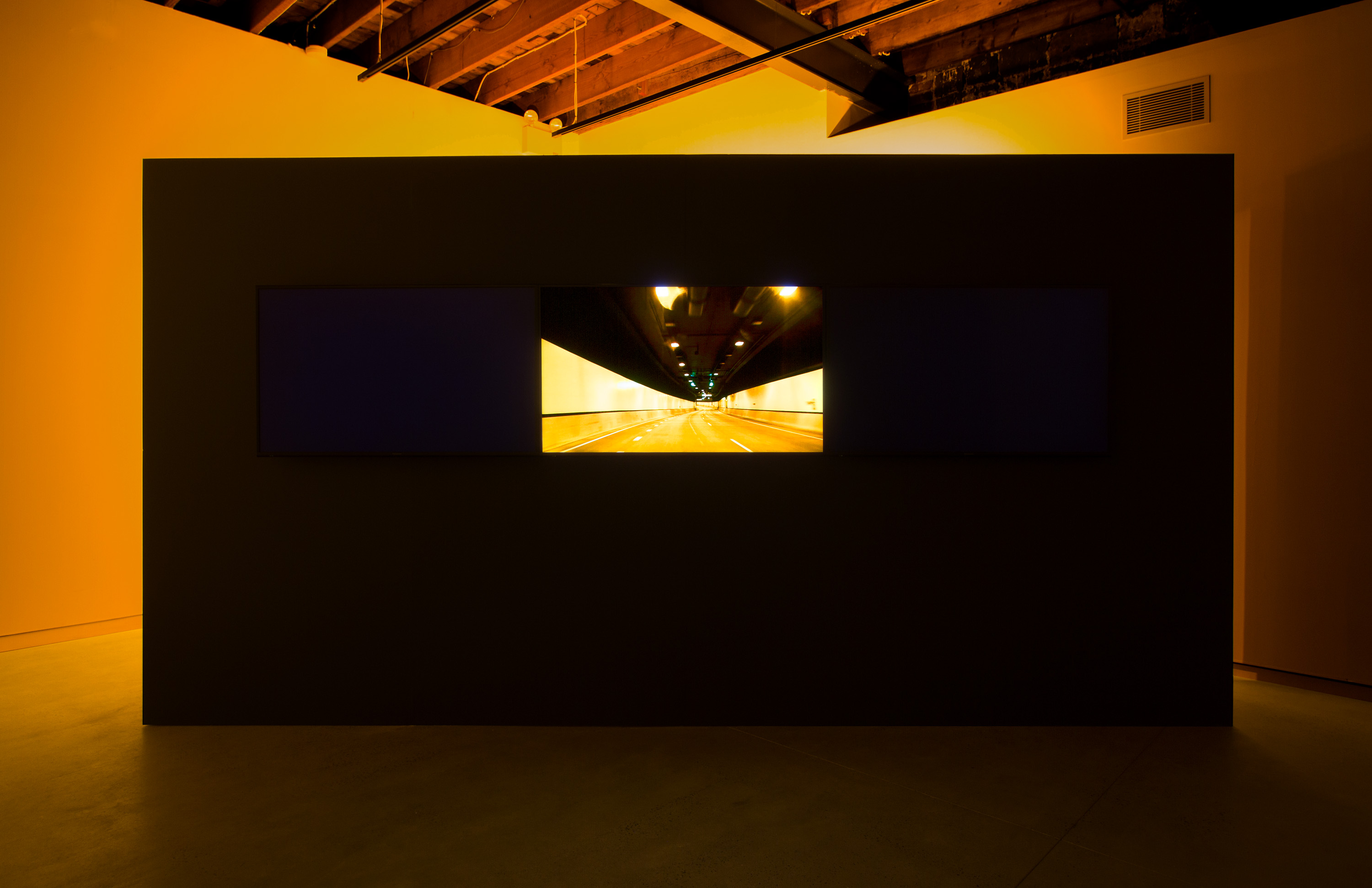 The videos are reminiscent of cinematic narratives, but do not reference any film in particular. Instead they evoke only an atmosphere that finds no resolution. The idea that a cinematic image could continue endlessly suggests that it might extend to the space beyond the frame. The light that spills from the screen is amplified via the bank of lights on the wall.