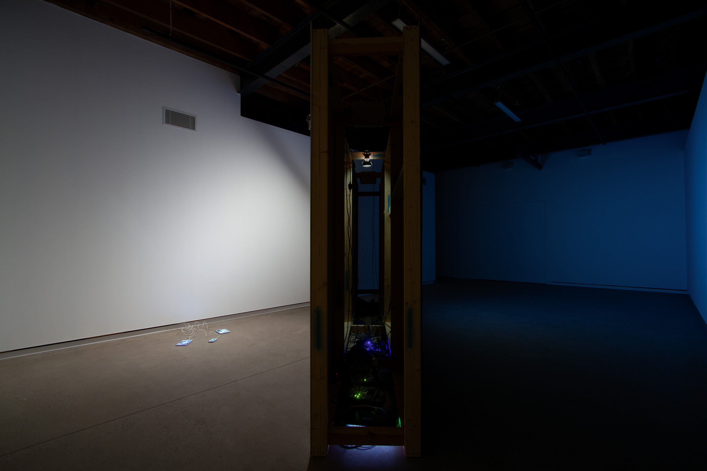The temporary wall that splits the space both conceals, and reveals, the equipment that powers the work. It also acts as an architectural and sculptural element. Likewise, the videos are perpetually moving, but owing to non-linear narratives, they remain in a type of stasis.